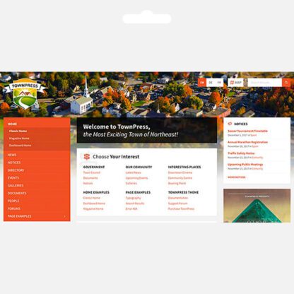 TownPress, küçük kasaba veya köyler için ideal bir WordPress temasıdır. Modern bir belediyenin ihtiyaçlarına yönelik olarak tasarlanmıştır. TownPress, yerel hava durumu widget’ı, liste dizini, yaklaşan etkinlikler, şehir belgeleri, galeriler, forumlar (bbPress eklentisi aracılığıyla) ve diğer pek çok niş özelliği sunar. Şehriniz veya kasabanızın web sitesi portalı için mükemmel bir tema!